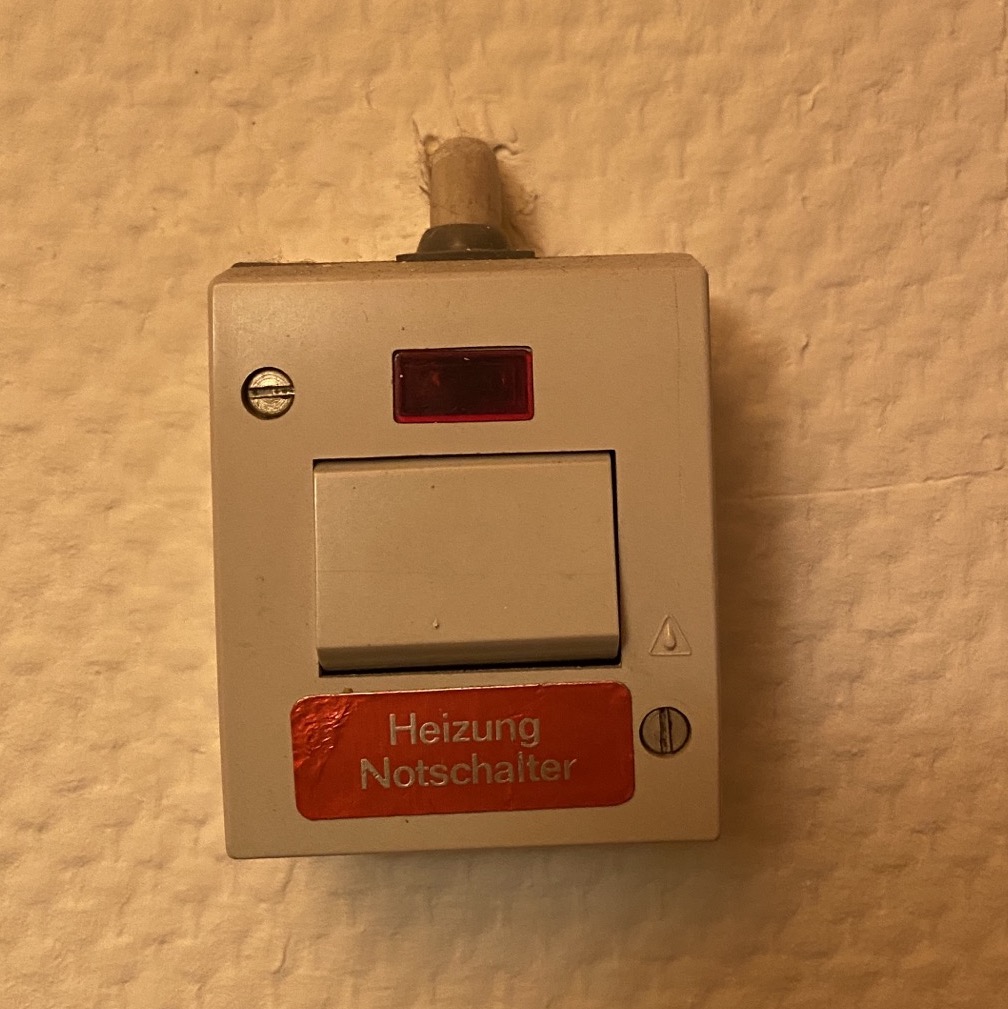 Prüfen, dass der Notaus Schalter im Flur nach oben (also deaktiviert) geschaltet ist.