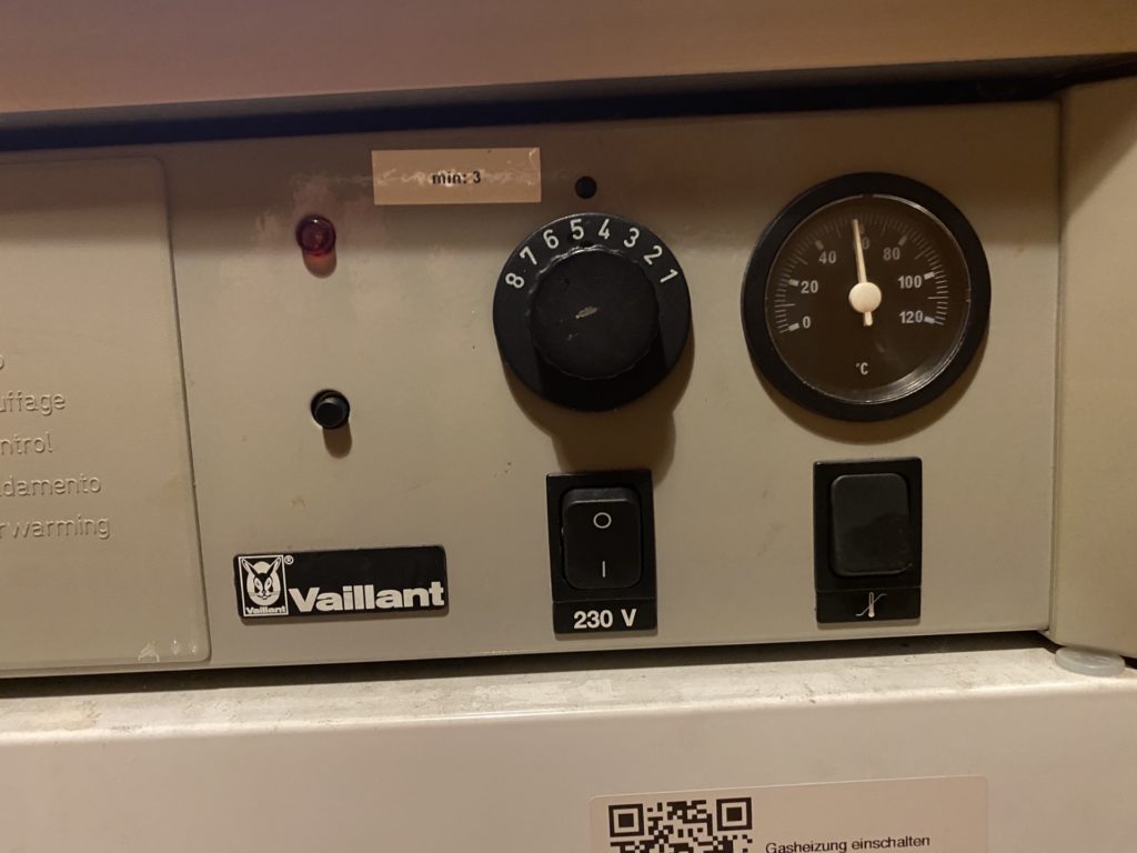 An der Heizung (in der Küche) den Drehregler ca. in die Mitte stellen und die Heizung auf EIN stellen (Schalter mit 230 V nach unten drücken).