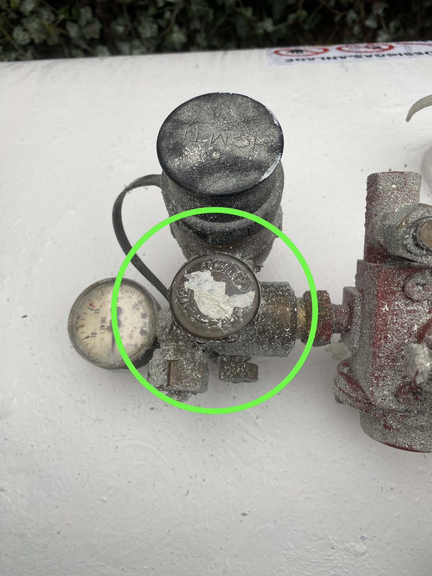 Prüfen, dass Gaszulauf (grüner Kreis im Bild) und Wasser Zu- und Ablauf (gelbe Kreise im Bild) aufgedreht (nach links drehen) sind.