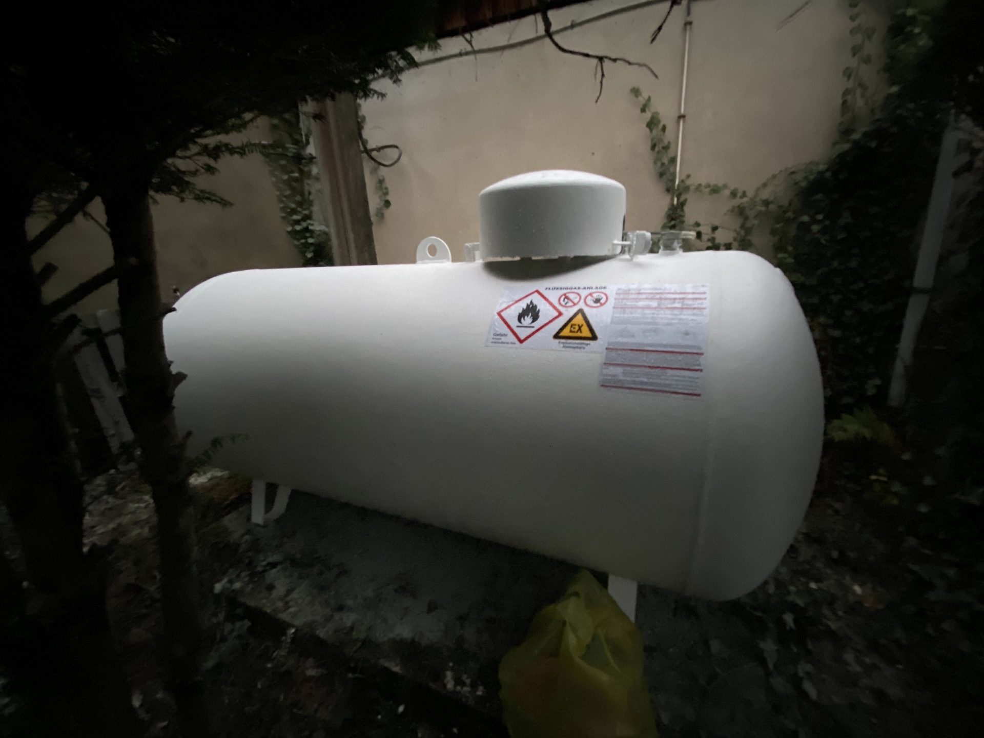 Den Gastank aufdrehen. Der Gastank befindet sich hinten rechts auf der Wiese.
