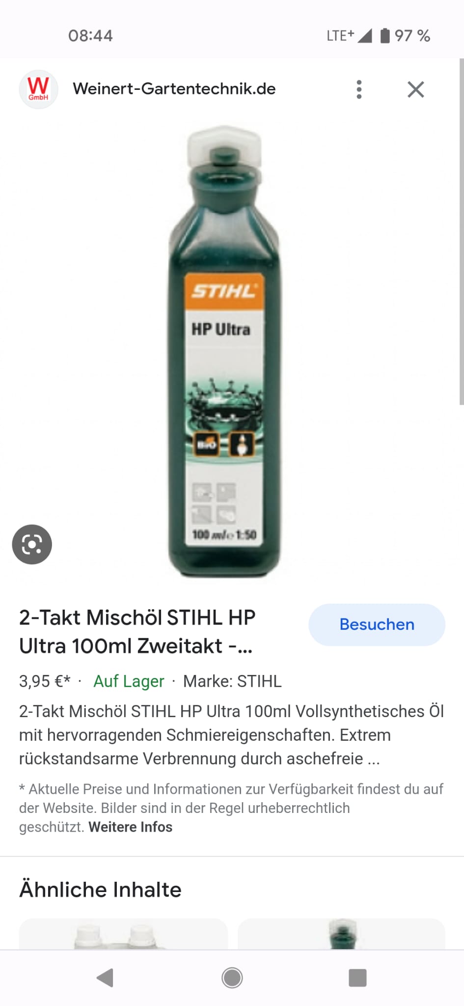Bitte ohne Absprache nichts anders außer dieses Gemisch verwenden (gibt's im Baumarkt). Denn der Vergaser muss unterschiedlich eingestellt werden, je nachdem was verwendet wird. Sonst läuft die Säge schneller heiß und verbraucht ggf. deutlich mehr.